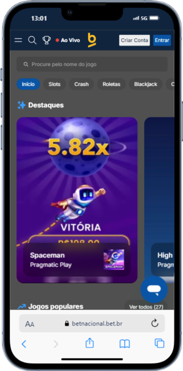 Na Betnacional, você pode apostar em diversas categorias de jogos, incluindo slots, live games e crash games. A seleção de jogos não decepciona e traz vários hits do momento, como Fortune Tiger, Gates of Olympus, Mines e Spaceman.
