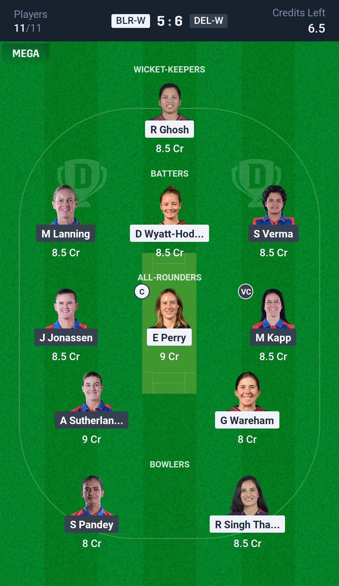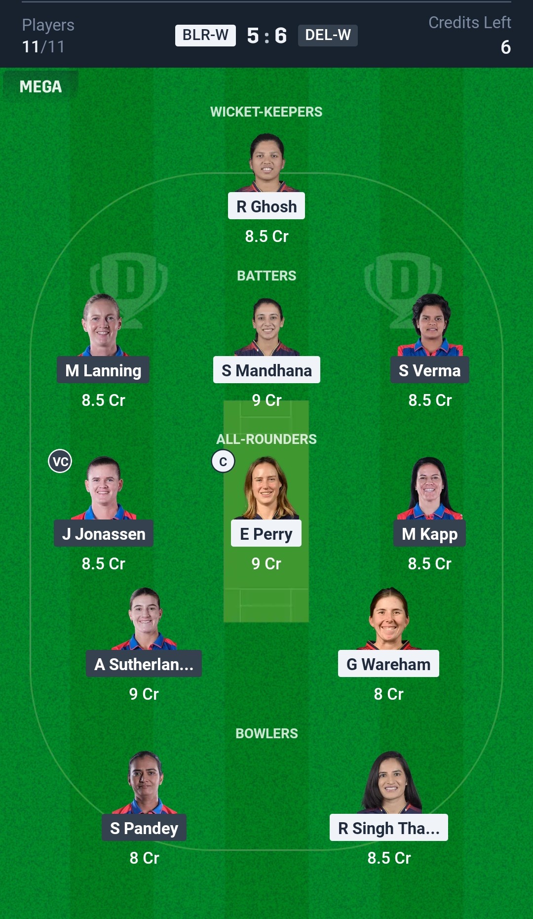 RCB Women: Smriti Mandhana (c), Danni Wyatt-Hodge, Ellyse Perry, Richa Ghosh (wk), Raghvi Bist, Kanika Ahuja, Georgia Wareham, Sneh Rana, Kim Garth, Ekta Bisht, Renuka Singh.
