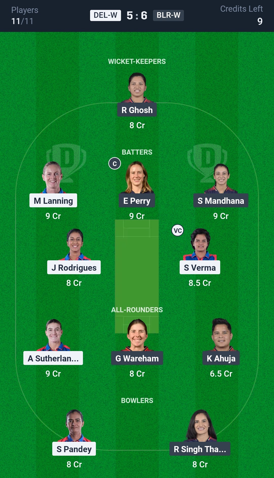 Delhi Capitals Women: Shafali Verma, Meg Lanning (c), Alice Capsey, Jemimah Rodrigues, Annabel Sutherland, Niki Prasad, Sarah Bryce (wk), Minnu Mani, Shikha Pandey, Arundhati Reddy, Radha Yadav