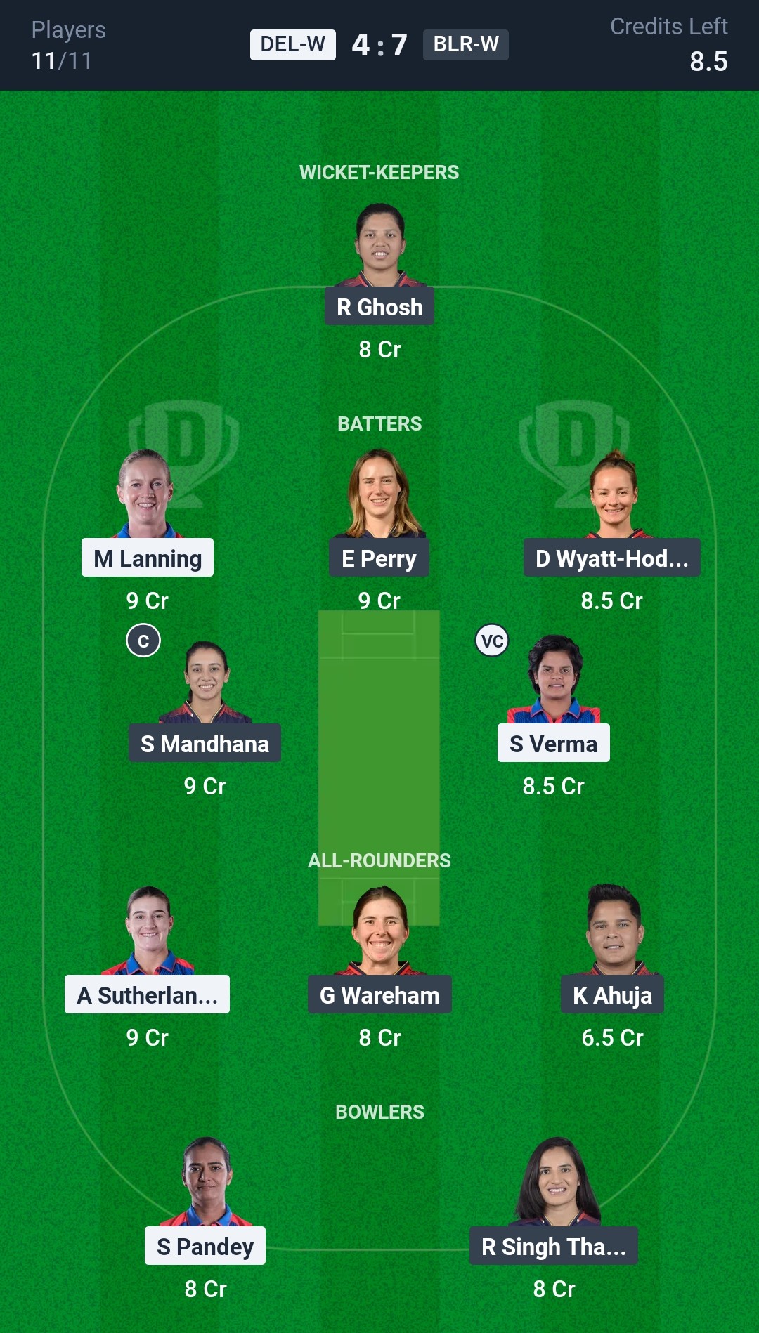 Royal Challengers Bengaluru Women: Smriti Mandhana (c), Danni Wyatt-Hodge, Ellyse Perry, Richa Ghosh (wk), Raghvi Bist, Kanika Ahuja, Georgia Wareham, Sneh Rana, Kim Garth, VJ Joshitha, Renuka Singh