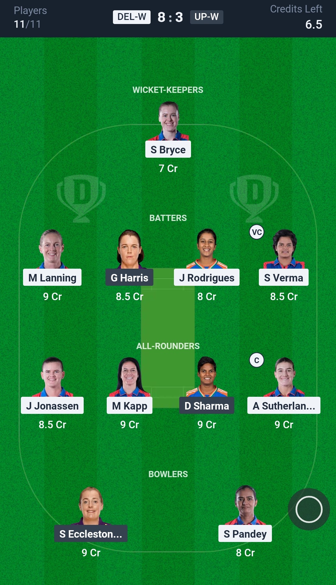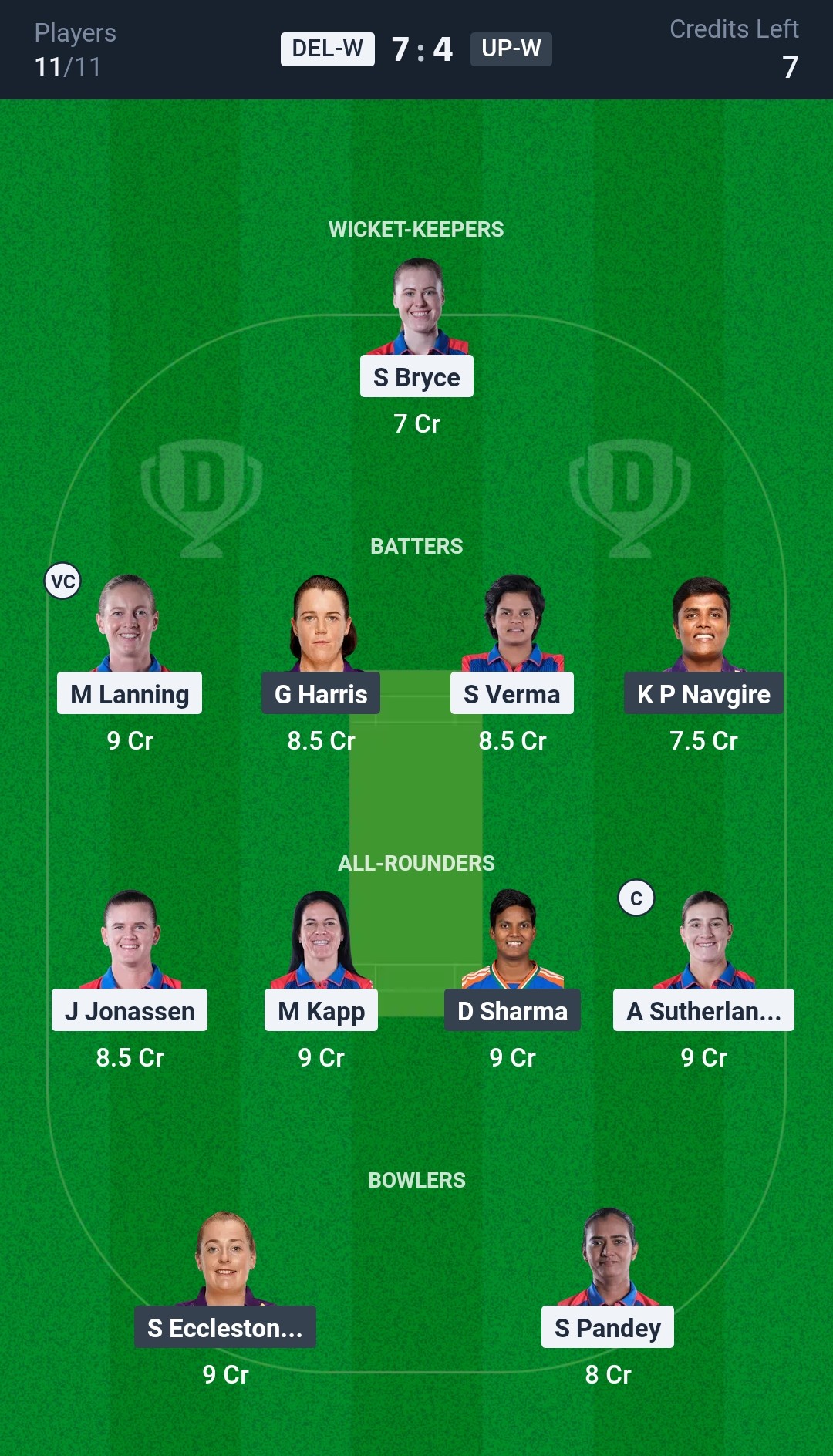 Delhi Capitals Women: Shafali Verma, Meg Lanning (c), Jemimah Rodrigues, Annabel Sutherland, Marizanne Kapp, Jess Jonassen, Sarah Bryce (wk), Minnu Mani, Shikha Pandey, Arundhati Reddy, Radha Yadav