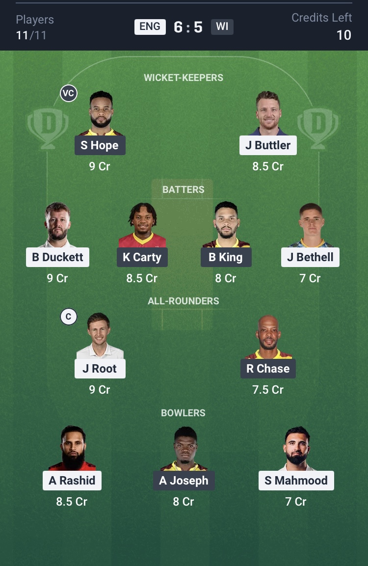 Jos Buttler, Shai Hope (vc), Ben Duckett, Brandon King, Keacy Carty, Jacob Bethell, Joe Root (c), Roston Chase, Adil Rashid, Alzarri Joseph, Saqib Mahmood