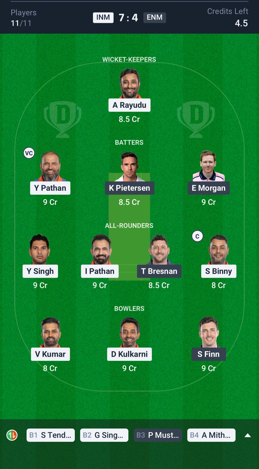 India Masters: Sachin Tendulkar (c), Gurkeerat Singh Mann, Yuvraj Singh, Ambati Rayudu (wk), Yusuf Pathan, Irfan Pathan, Stuart Binny, Shahbaz Nadeem, Vinay Kumar, Abhimanyu Mithun, Dhawal Kulkarni
