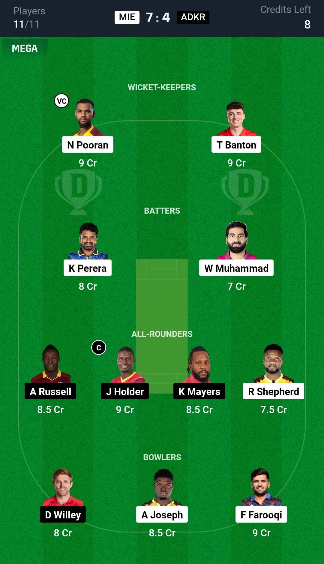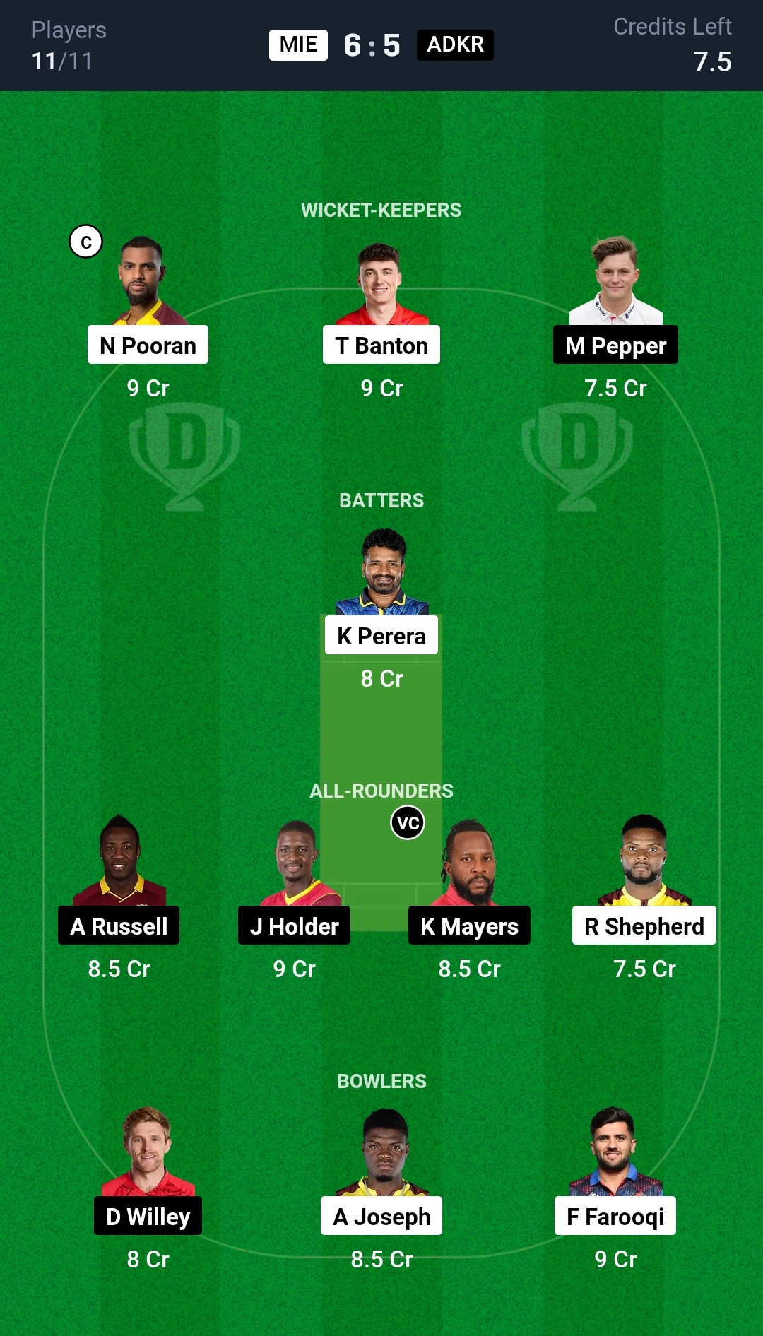 MI Emirates: Muhammad Waseem, Kusal Perera, Tom Banton, Nicholas Pooran (c & wk), Kieron Pollard, Dan Mousley, Romario Shepherd, Akeal Hosein, Alzarri Joseph, Waqar Salamkhein, Fazalhaq Farooqi, Zahoor Khan