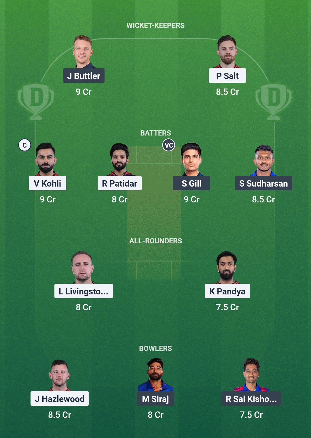 Gujarat Titans: Sai Sudharsan, Shubman Gill (c), Jos Buttler (wk), Shahrukh Khan, Sherfane Rutherford, Rahul Tewatia, Rashid Khan, Kagiso Rabada, Sai Kishore, Mohammed Siraj, Prasidh Krishna