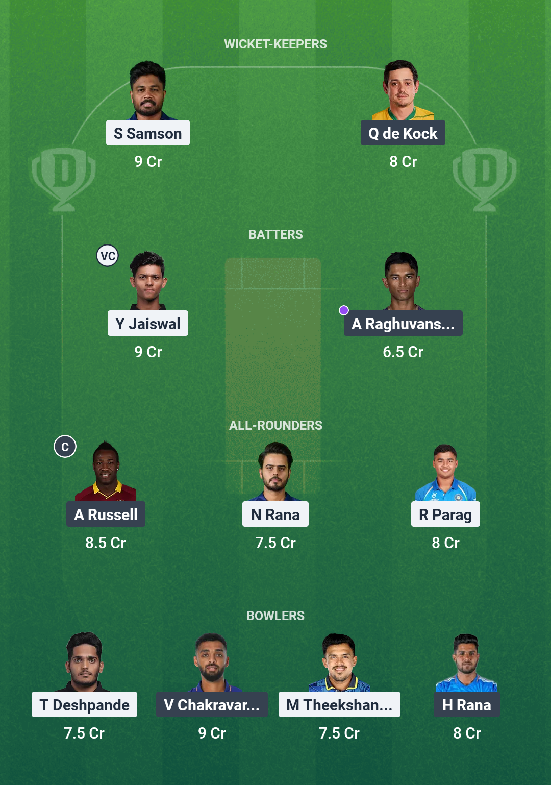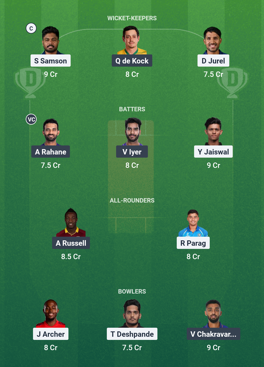 Grand League Team for RR vs KKR Dream11 Prediction