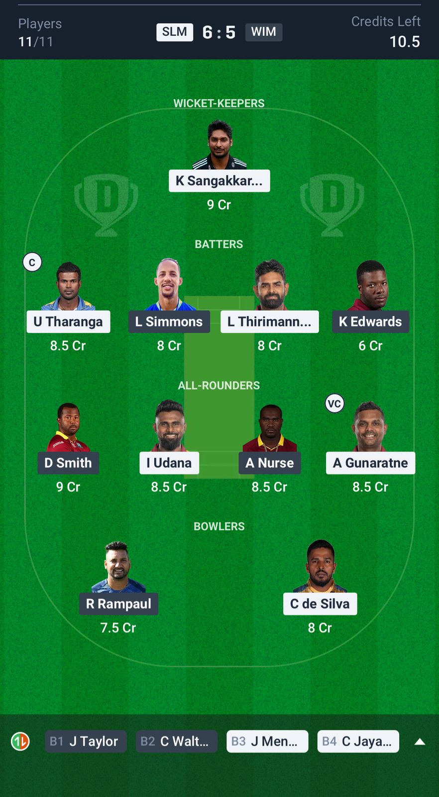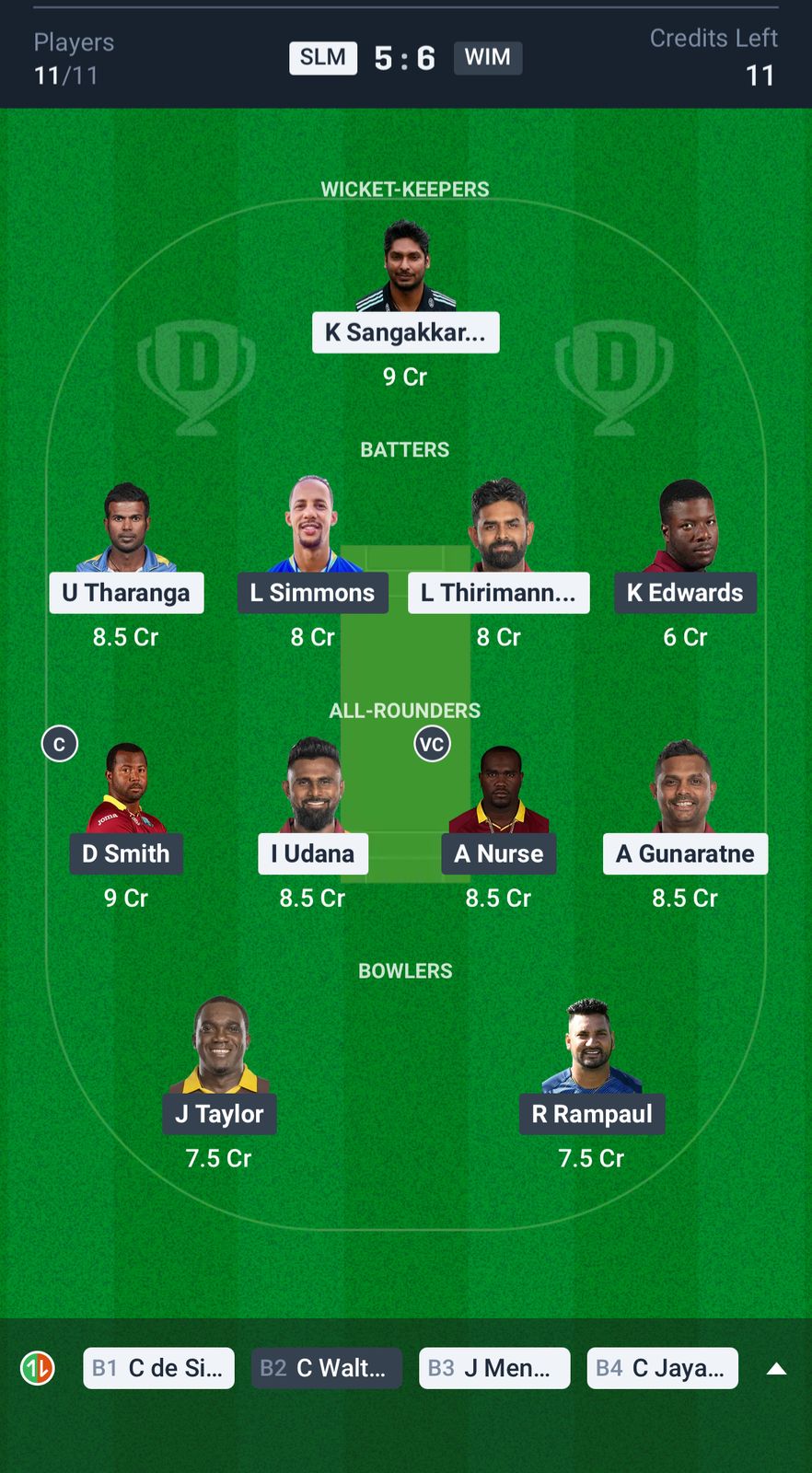 Sri Lanka Masters: Upul Tharanga, Kumar Sangakkara (wk/c), Lahiru Thirimanne, Asela Gunaratne, Chinthaka Jayasinghe, Chaturanga de Silva, Jeevan Mendis, Isuru Udana, Nuwan Pradeep, Seekkuge Prasanna, Dhammika Prasad.