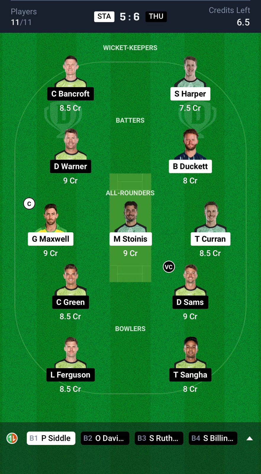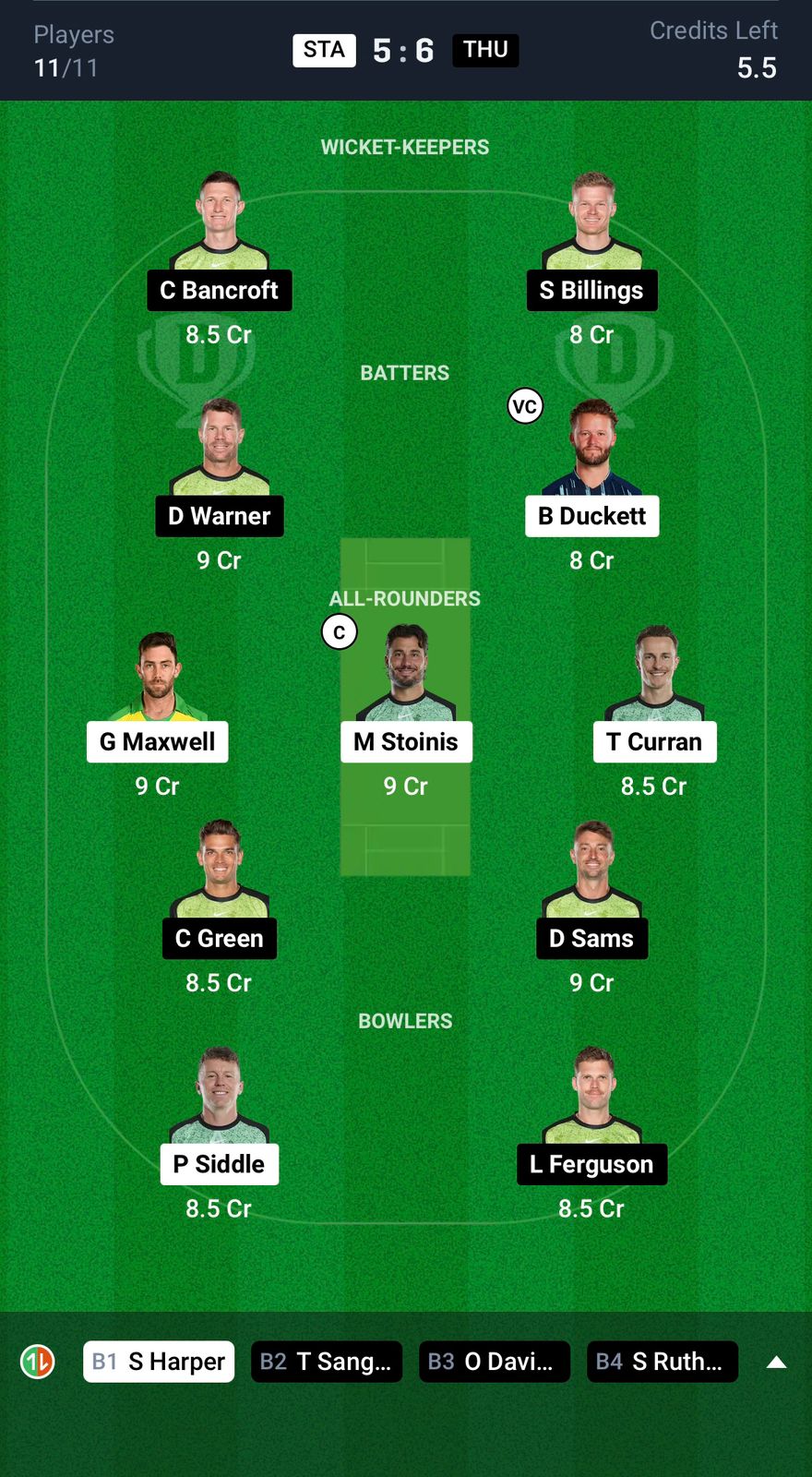 Melbourne Stars: Sam Harper (wk), Ben Duckett, Marcus Stoinis (c), Glenn Maxwell, Thomas Fraser Rogers, Hilton Cartwright, Tom Curran, Jonathan Merlo, Usama Mir, Doug Warren, Peter Siddle