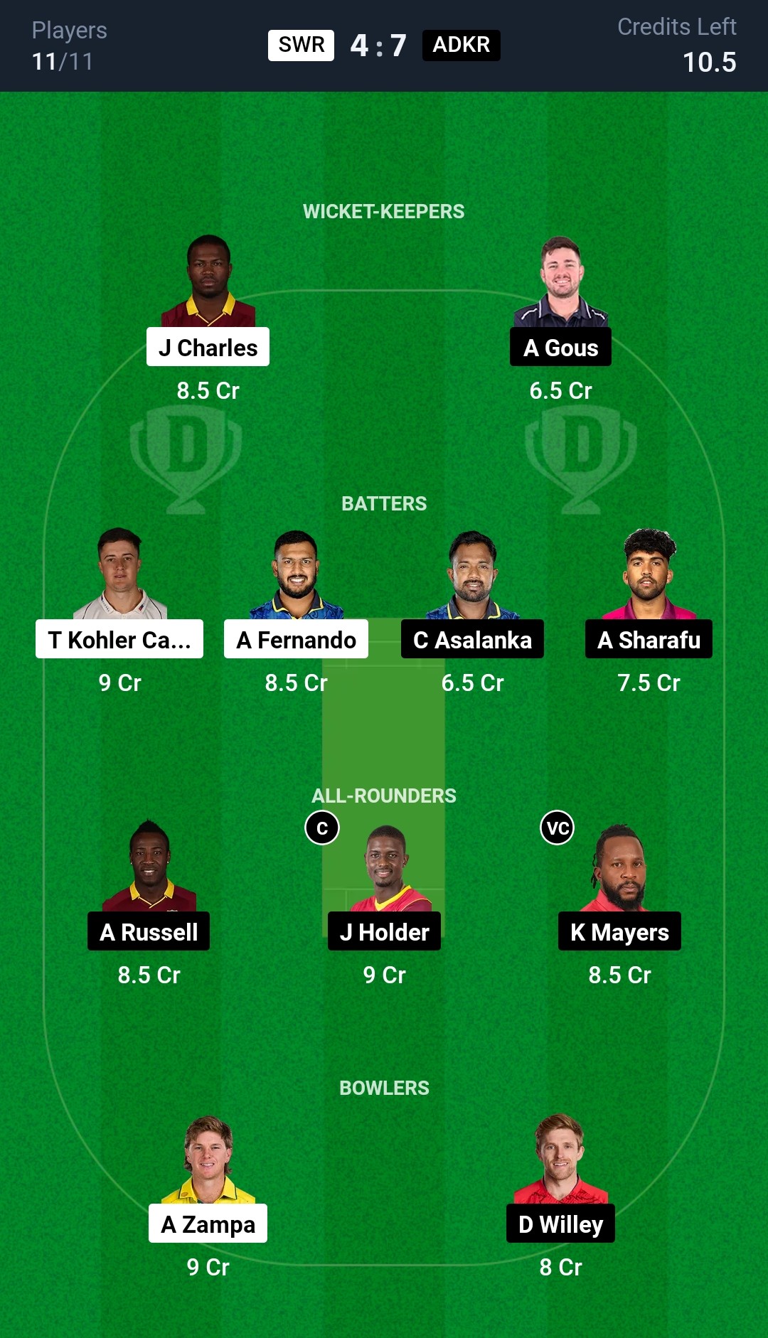 Abu Dhabi Knight Riders: Kyle Mayers, Andries Gous, Michael Pepper (wk), Charith Asalanka, Alishan Sharafu, Andre Russell, Laurie Evans, Jason Holder, Sunil Narine (c), David Willey, Ibrar Ahmad, Ali Khan