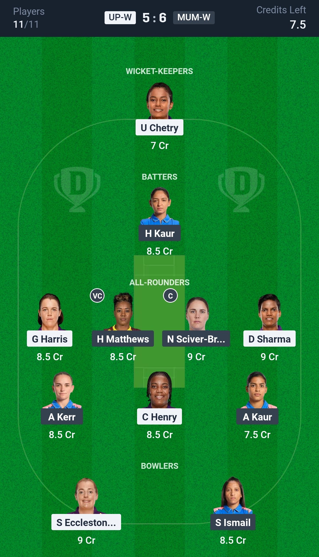 UP Warriorz Women: Kiran Navgire, Grace Harris, Georgia Voll, Vrinda Dinesh, Deepti Sharma (c), Shweta Sehrawat, Chinelle Henry, Uma Chetry (wk), Sophie Ecclestone, Saima Thakor, Kranti Goud.