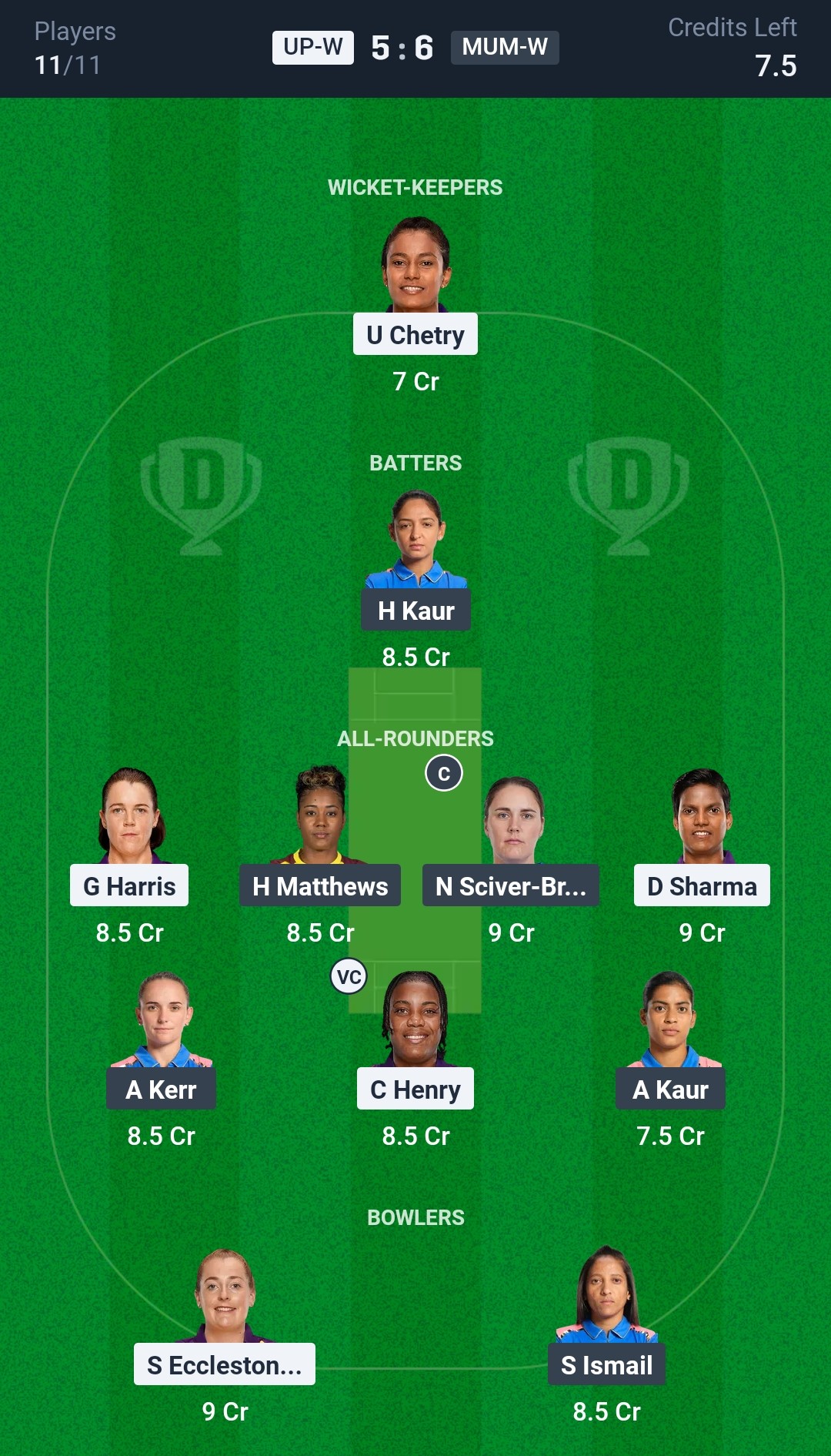 Mumbai Indians Women: Yastika Bhatia (wk), Hayley Matthews, Nat Sciver-Brunt, Harmanpreet Kaur (c), Amelia Kerr, Sajeevan Sajana, Amanjot Kaur, G Kamalini, Sanskriti Gupta, Shabnim Ismail, Parunika Sisodia.