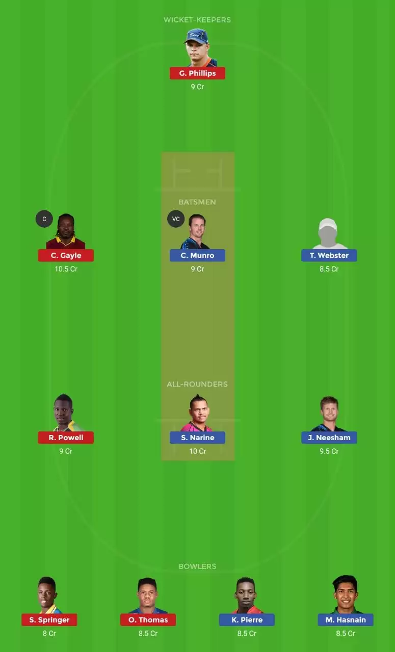 Colin Munro was brilliant for TKR last season and should continue from where he left. Along with the Kiwi, Chris Gayle and Andre Russell are also viable options considering their form and ability to win matches singlehandedly. JT captain, Rovman Powell is also one to watch out for while Jimmy Neesham and Glenn Phillips should also earn some fantasy points. Hasnain and Pierre have been consistently picking wickets and will be expected to continue in the same vein along with Oshane Thomas.