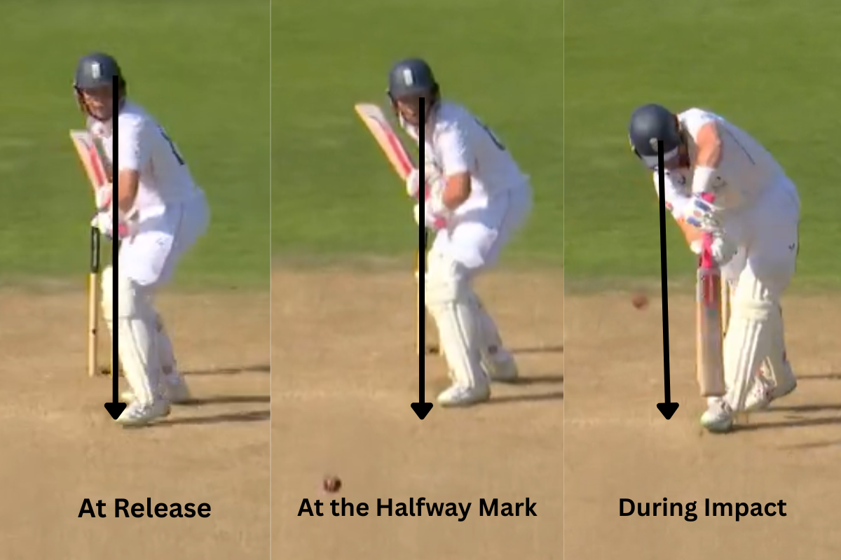 As we can see, the first part of the image is during release. This is the closest his head is to where it actually should be. The shoulder has also opened up a bit, and there are glimpses of his right shoulder coming through. He is anticipating the ball to pitch in line and move away. The second part of the image is the one after release. Though the ball is on its trajectory to pitch in line, his head has already started falling over. Also, his front foot is fully planted when the ball is halfway through. His technique isn’t going to allow him to take a full stride ahead. The last image is when he makes contact. We can see that his head has fallen over, front foot nowhere in position, and bat pointing towards mid-on. His front foot isn’t fully planted, even at the time of impact.