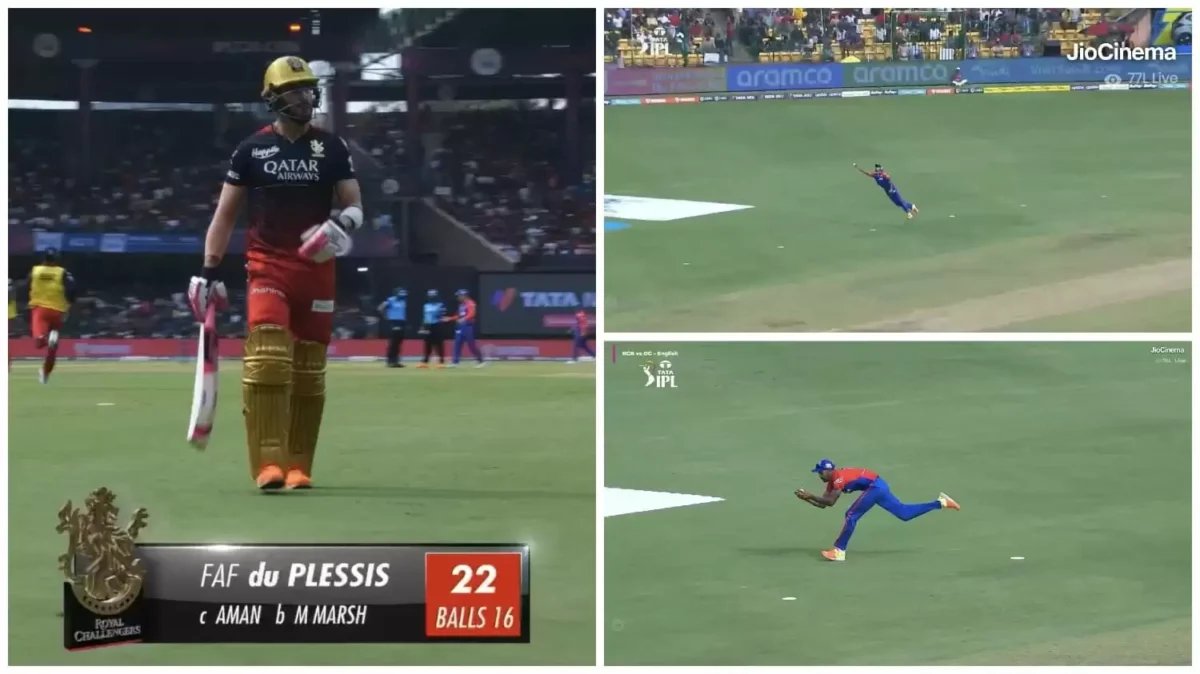 Aman Hakim Khan took a fantastic catch to dismiss the RCB captain Faf du Plessis. The Proteas batter, Faf du Plessis, along with Virat Kohli, were off to a rapid start against Delhi Capitals. They amassed as many as 42 runs in the first four-and-a-half overs and looked set to post another big total on a belter of a track.