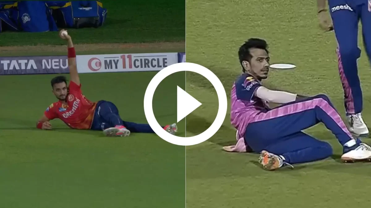 Harshal mimicked spinner Yuzvendra Chahal’s iconic cross-legged pose after taking a sliding catch to remove CSK batter Sameer Rizvi.