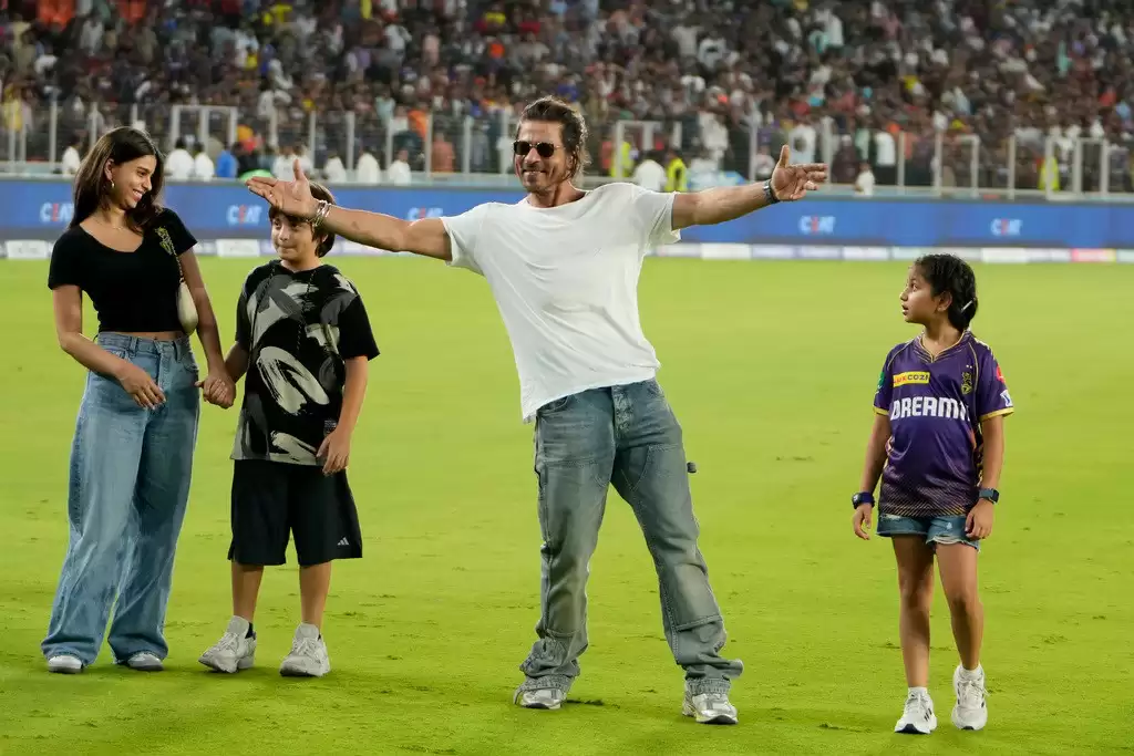 The official Instagram page of KKR also shared pictures and videos of the family’s celebratory walk. SRK chants filled the stadium and the actor delighted fans with his iconic open-arms pose.