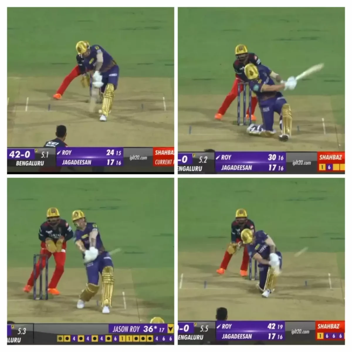 Jason Roy, who has been in sublime form while playing for the KKR, smashed four sixes off Shahbaz Ahmed in the last over of the powerplay in the first innings. The English batter stepped in with all the guns blazing on a belter of a track against Royal Challengers Bangalore in M Chinnaswamy Stadium.