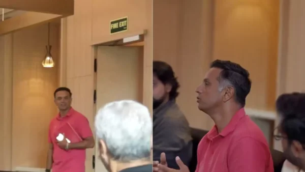 Dressed in a pink T-shirt, matching the Rajasthan team’s colour, Dravid is seen walking into a room for a meeting with the franchise’s officials.