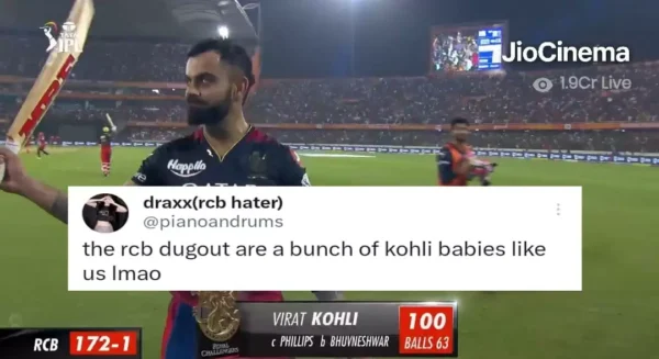 Virat Kohli amassed a magnificent century against Sunrisers Hyderabad in a must-win game for Royal Challengers Bangalore (RCB) at the Rajiv Gandhi International Stadium, Hyderabad. The whole dugout was on their feet to bow down to one of the greatest-ever batters as Virat reached his century.