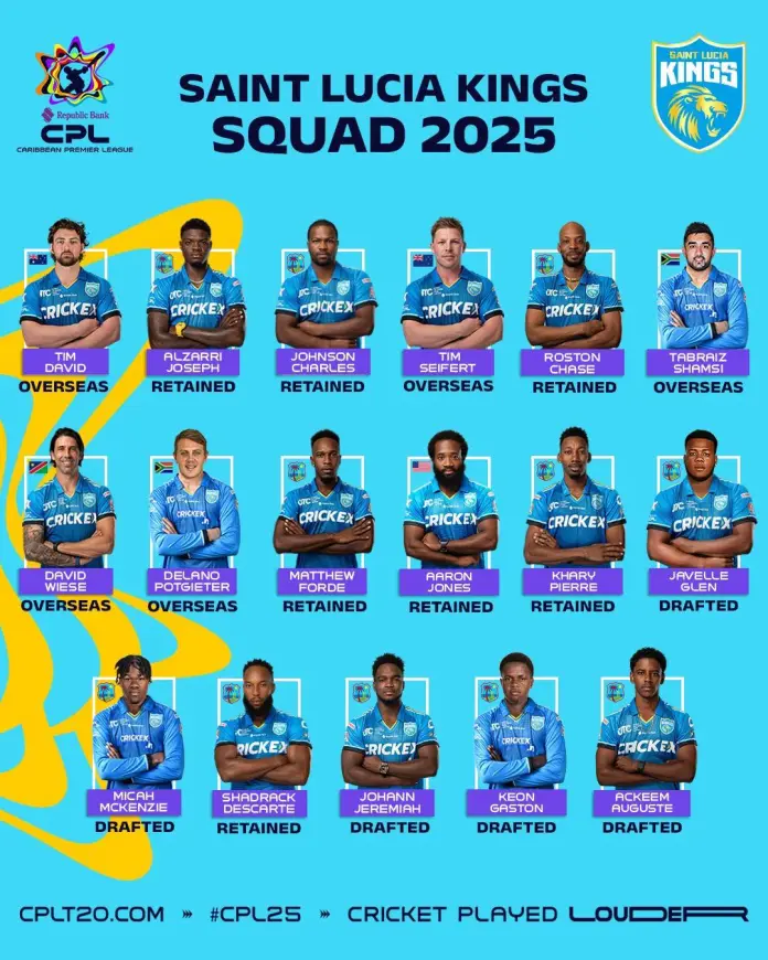 St.Lucia Kings: Tim David, Alzarri Joseph, Johnson Charles, Tim Seifert, Roston Chase, Tabraiz Shamsi, David Wiese, Delano Potgieter, Matthew Forde, Aaron Jones, Khary Pierre, Javelle Glen, Micah McKenzie, Shadrack Descarte, Johann Jeremiah, Keon Gaston, Ackeem Auguste