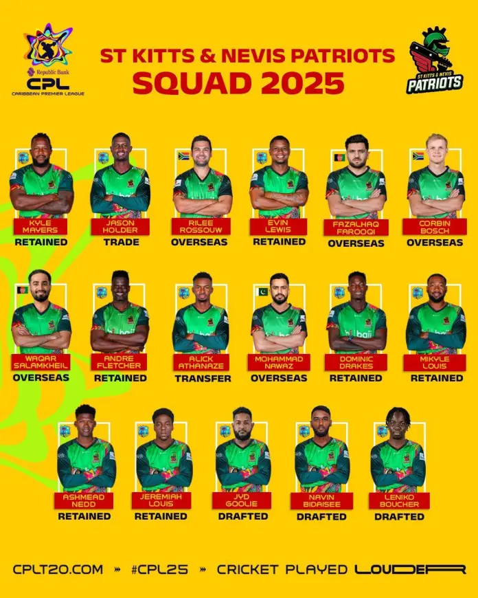 St.Kitts and Nevis Patriots: Kyle Mayers, Jason Holder, Rilee Rossouw, Evin Lewis, Fazalhaq Farooqi, Corbin Bosch, Waqar Salamkheil, Andre Fletcher, Alick Athanaze, Mohammad Nawaz, Dominic Drakes, Mikyle Louis, Ashmead Nedd, Jeremiah Louis, Jyd Goolie, Navin Bidaisee, Leniko Boucher