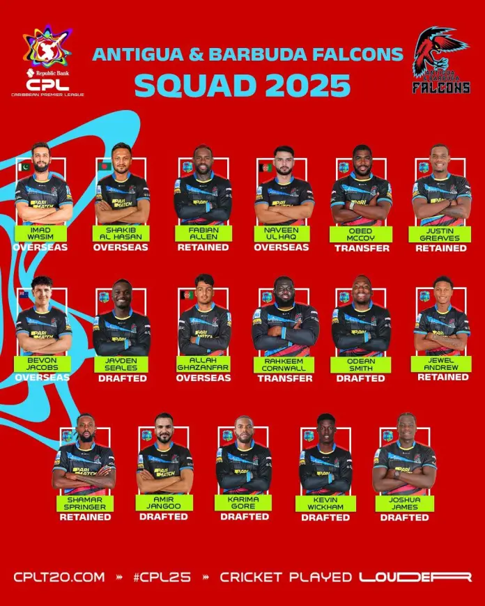 Antigua and Barbuda Falcons: Imad Wasim, Shakib Al Hasan, Fabian Allen, Naveen-ul-Haq, Obed McCoy, Justin Greaves, Bevon Jacobs, Jayden Seales, Allah Ghazanfar, Rahkeem Cornwall, Odean Smith, Jewel Andrew, Shamar Springer, Amir Jangoo, Karima Gore, Kevin Wickham, Joshua James