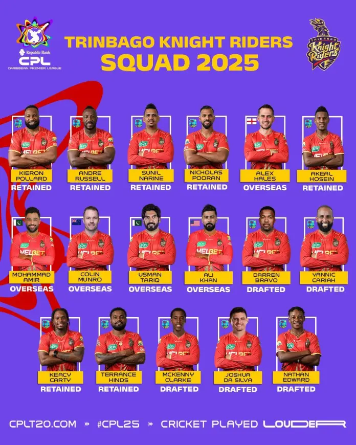 Trinbago Knight Riders: Kieron Pollard, Andre Russell, Sunil Narine, Nicholas Pooran, Alex Hales, Akeal Hosein, Mohammad Amir, Colin Munro, Usman Tariq, Ali Khan, Darren Bravo, Yannic Cariah, Keacy Carty, Terrance Hinds, McKenny Clarke, Joshua Da Silva, Nathan Edward