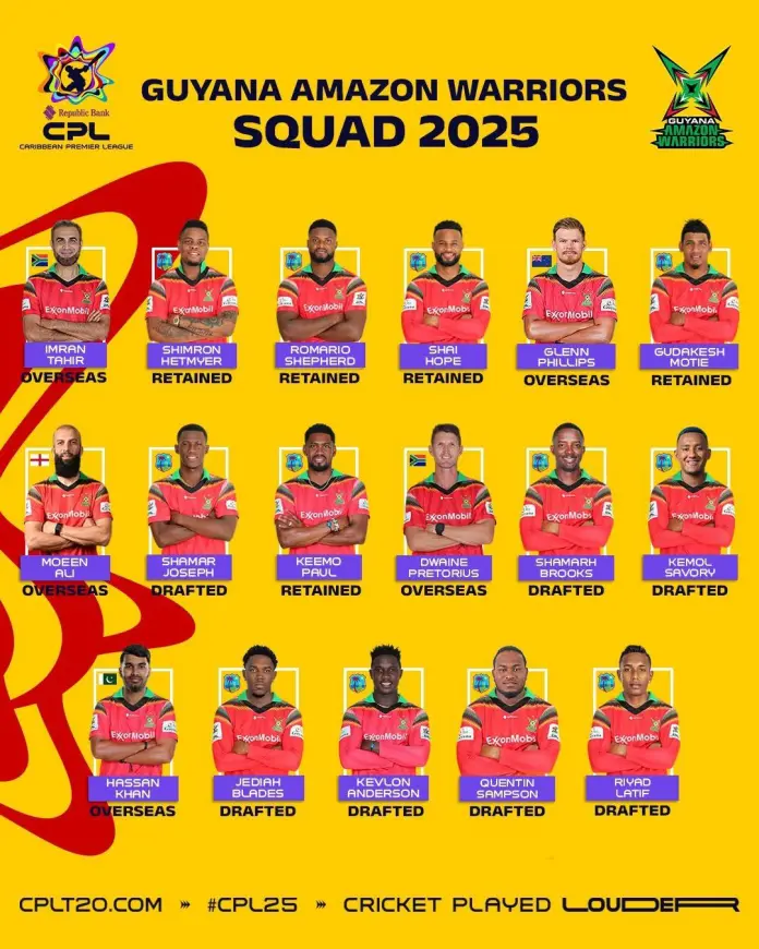 Guyana Amazon Warriors: Imran Tahir, Shimron Hetmyer, Romario Shepherd, Shai Hope, Glenn Phillips, Gudakesh Motie, Moeen Ali, Shamar Joseph, Keemo Paul, Dwaine Pretorius, Shamarh Brooks, Kemol Savory, Hassan Khan, Jediah Blades, Kevlon Anderson, Quentin Sampson, Riyad Latif