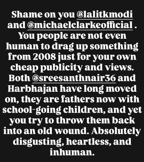 “Shame on you, Lalit Modi and Michael Clarke. You people are not even human to drag up something from 2008 just for your own cheap publicity and views. Both @sreesanthnair36 and Harbhajan have long moved on; they are fathers now with school-going children, and yet you try to throw them back into an old wound. Absolutely disgusting, heartless, and inhuman,” she wrote.