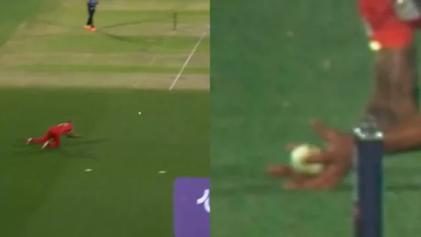Sam Curran bowled a fuller-length delivery outside the off-stump line to Shimron Hetmyer. The southpaw tried hitting an aerial drive over cover, but he couldn’t get the required elevation as the bat turned up a bit while hitting the shot, which also reduced the power of the stroke.
