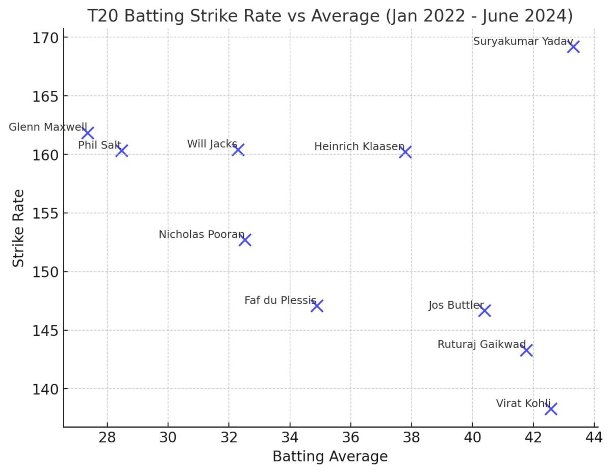To show you how ridiculous these numbers were, among batters with a minimum of 1500 runs in this period, Suryakumar ranked third on the best averages and only Andre Russell had a better strike rate than him. His closest rival in this period was Heinrich Klaasen, who struck at 160.22 while averaging 37.78.