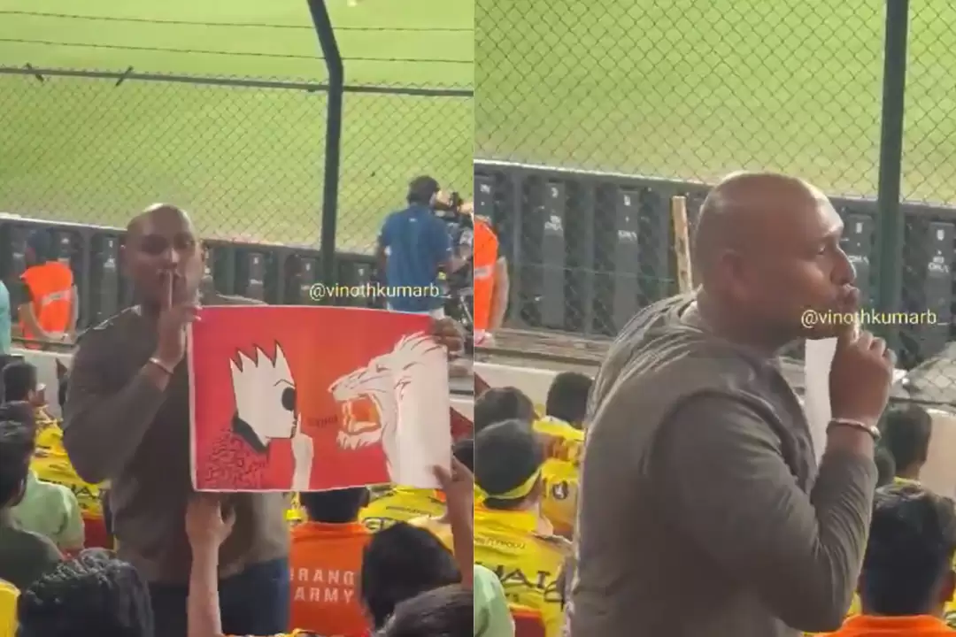 The SRH fan was seen silencing the CSK fans and showed a poster replicating the same as well. In the poster, a man was shown to be silencing the CSK’s lion by showing the finger on the lips. This happened during the time when SRH batters were going all guns blazing and just took CSK’s bowling apart.