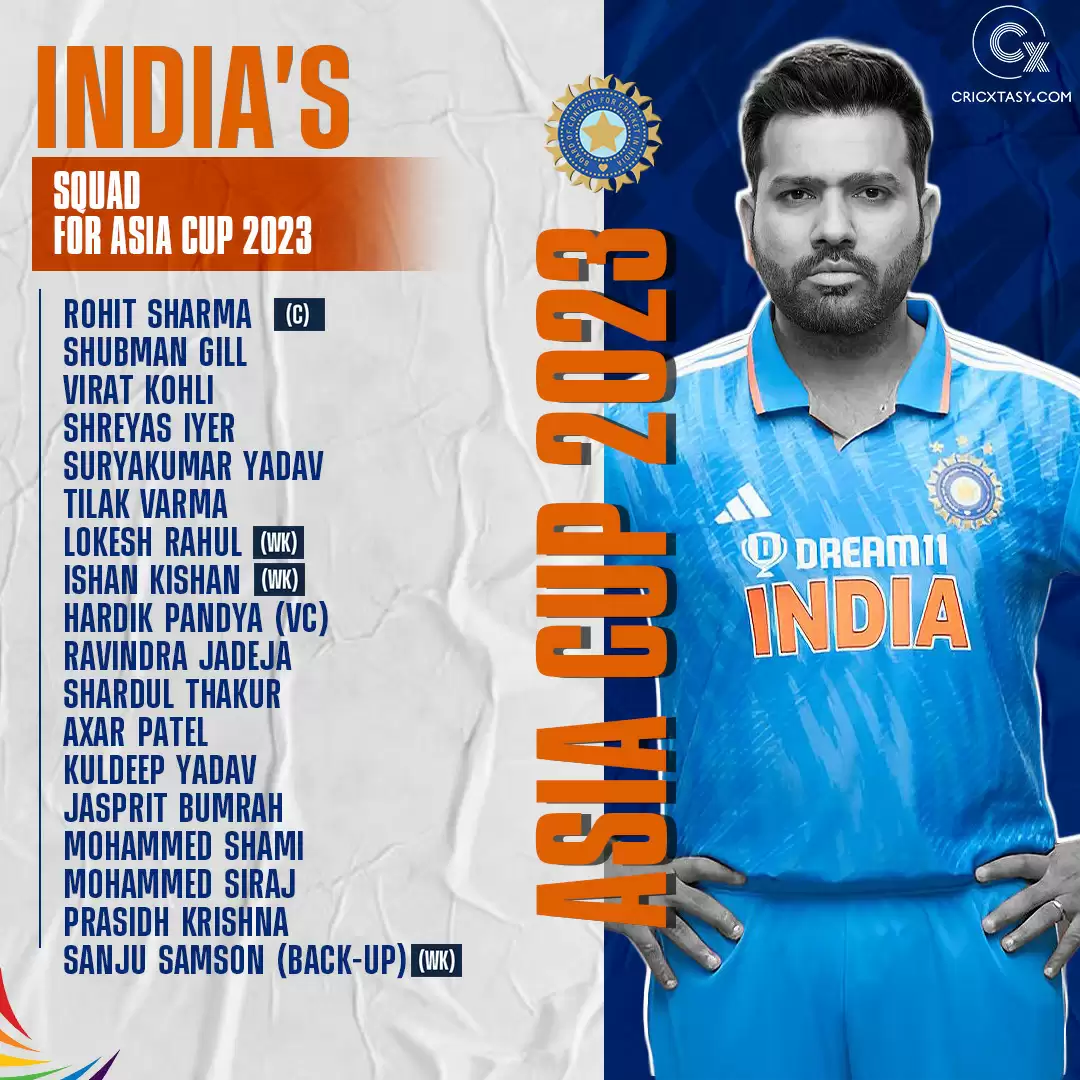 India squad for Asia Cup: Rohit Sharma (Captain), Shubman Gill, Virat Kohli, Shreyas Iyer, Suryakumar Yadav, Tilak Varma, KL Rahul, Ishan Kishan, Hardik Pandya (VC), Ravindra Jadeja, Shardul Thakur, Axar Patel, Kuldeep Yadav, Jasprit Bumrah, Mohd. Shami, Mohd. Siraj, Prasidh Krishna