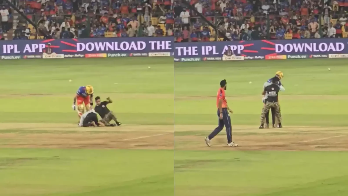 During the ongoing clash between Royal Challengers Bengaluru (RCB) and Punjab Kings (PBKS) at the M Chinnaswamy Stadium in the Indian Premier League (IPL 2024), a fan breached security to touch batting stalwart Virat Kohli’s feet while he was batting in the middle.