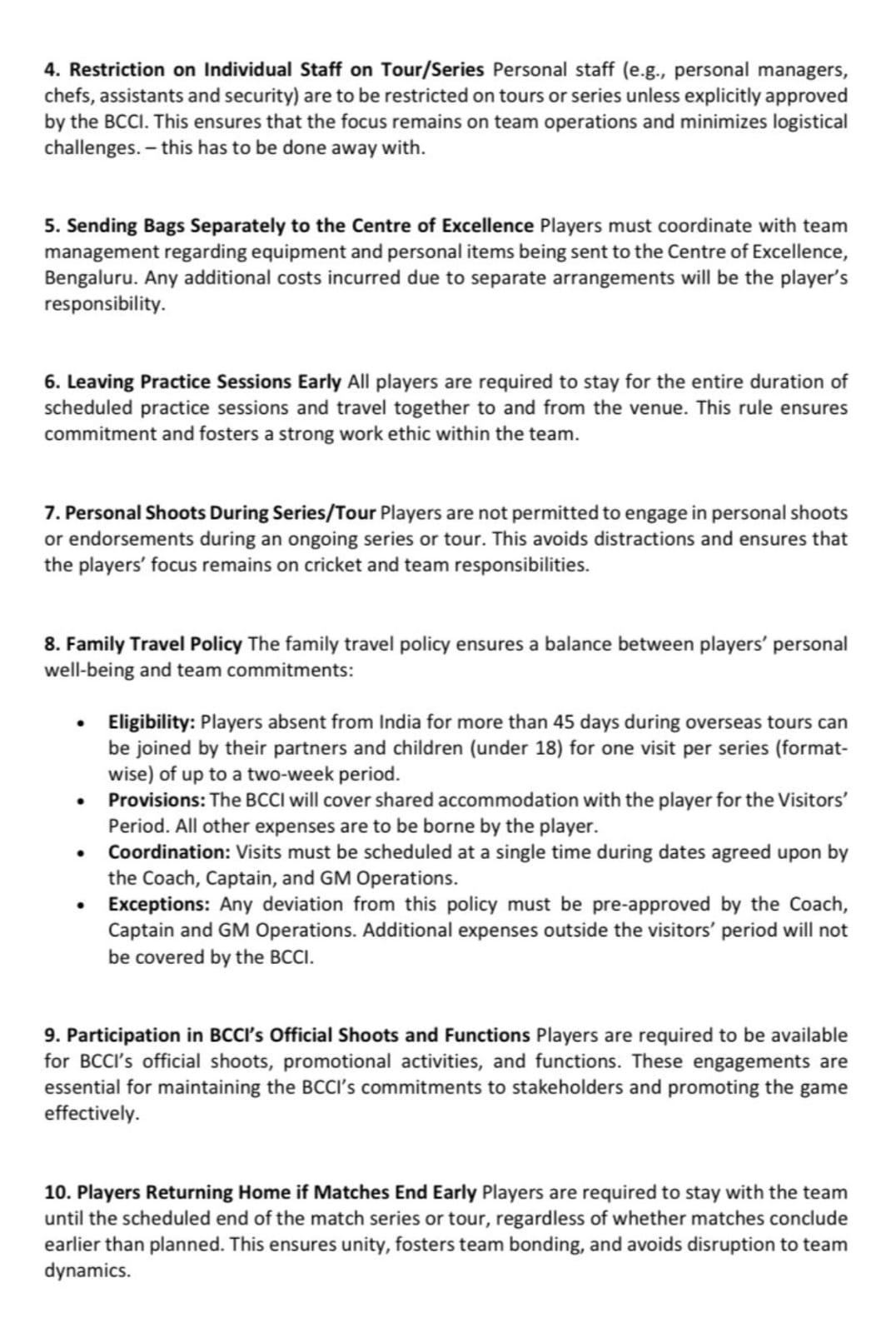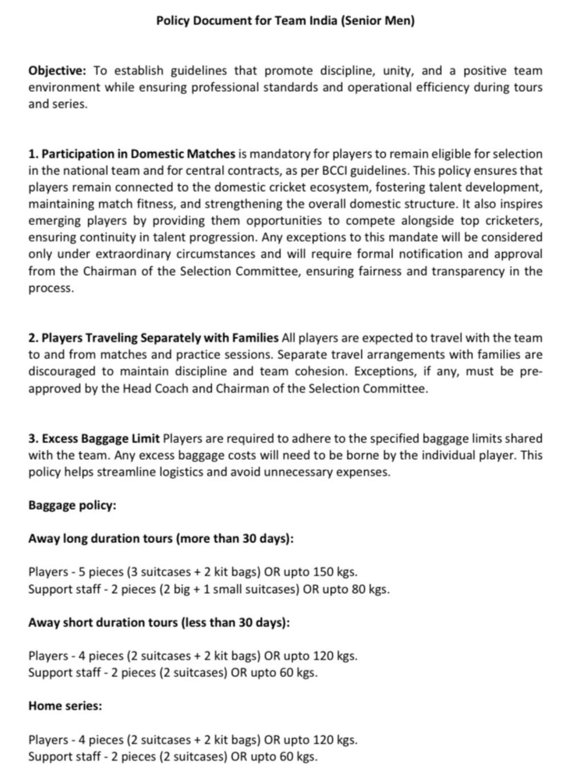 “All players are expected to adhere strictly to the above guidelines. Any exceptions or deviations must be pre-approved by the Chairman of the Selection Committee and Head Coach. Non-compliance may lead to disciplinary action as deemed appropriate by the BCCI”