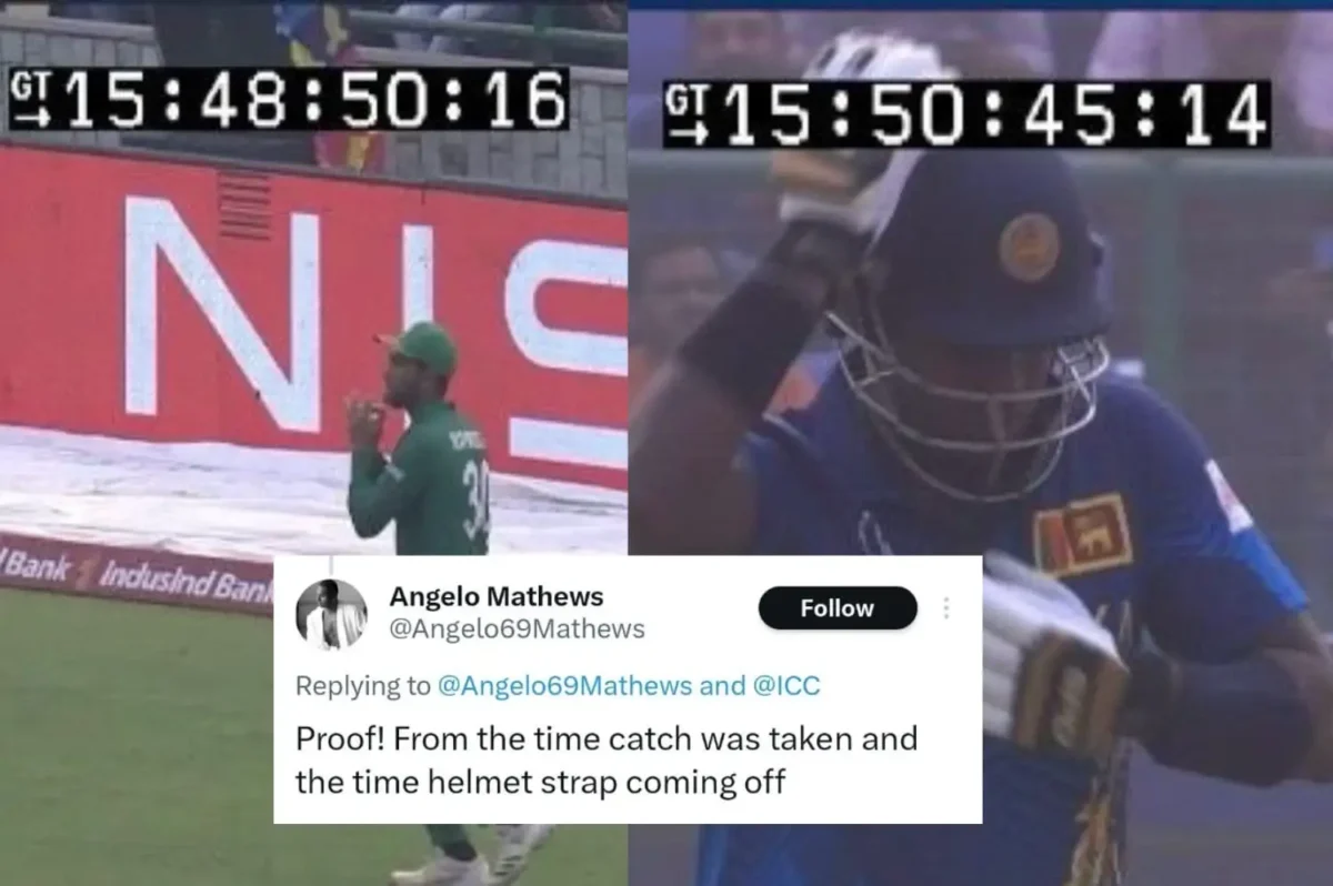 The time allotted for a new batter to get ready in the Cricket World Cup playing conditions is two minutes. Mathews, with screenshots of the footage, proved that from the time the catch was taken to him getting ready to face the ball, it was five seconds less than two minutes.