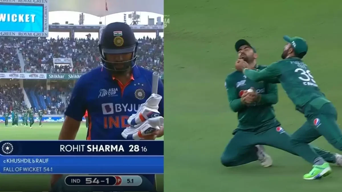 The near mishap is from the beginning of the sixth over in the Indian first-innings batting effort. Facing a full-pitched delivery outside off from seamer Haris Rauf, Rohit Sharma ended up mistiming his attempted big hit down the ground and got a top-edge that flew towards the mid-off region.