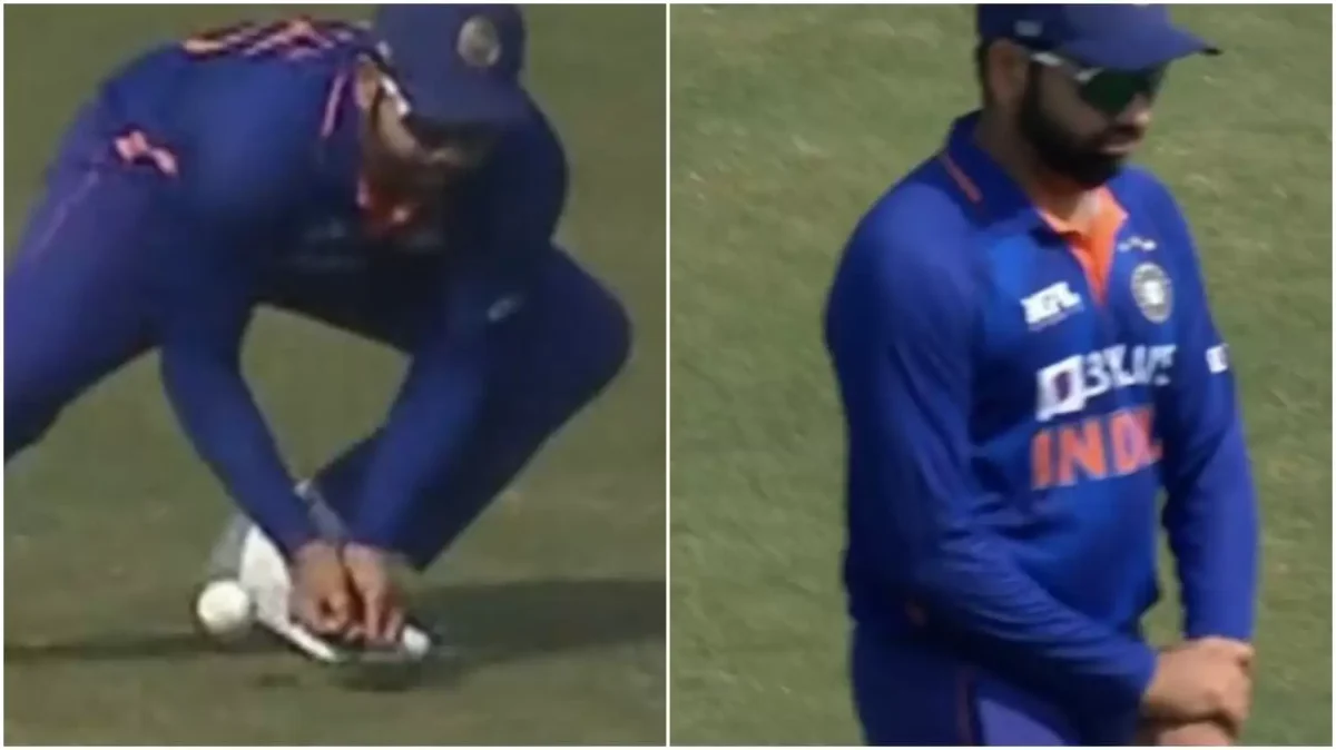 Rohit Sharma went down to collect the catch at second slip but it fell out of his hand and hurt the side of his left hand, leading to a painful cut and a bruise.