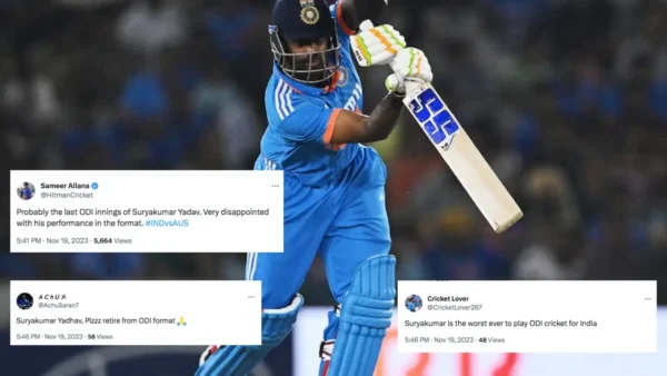 During the ongoing 2023 ODI World Cup Final between India and Australia, Suryakumar Yadav found himself in a pivotal position during the India innings. Entering the crease during the 36th over with Team India struggling at 178 for 5, Suryakumar Yadav faced the challenge of adding quick runs to the scoreboard, especially with KL Rahul holding the fort at the opposite end.