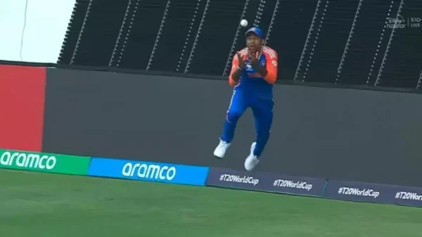 Suryakumar took the catch near the boundary rope where he had to time it to perfection as he had to cross over the boundary rope while releasing the ball in the air and making it in time onto the ground to complete the catch.