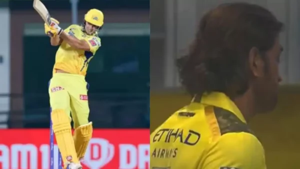 In the 19th over of the match, when CSK were on brink of the win, Shivam Dube smashed Alzarri Joseph for a stunning pull shot that went for a massive six over deep backward square leg. MS Dhoni, who was in the dressing room, was visibly impressed with the shot, as his facial expressions would tell.