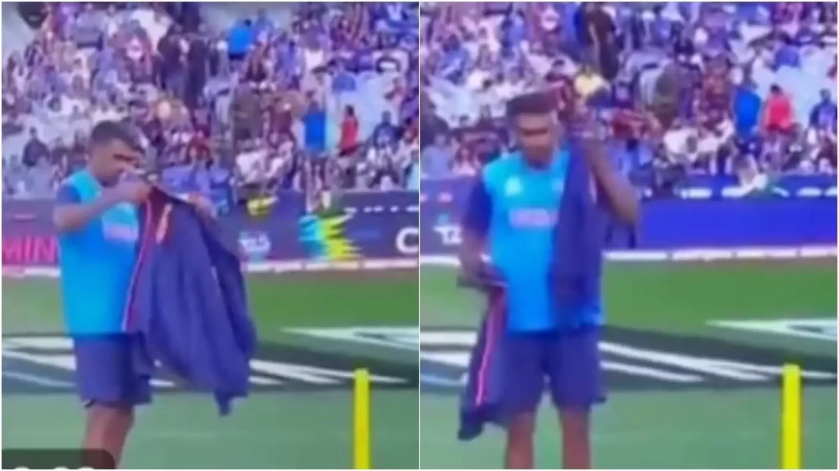 The off-spinner was spotted finding his clothes in a hilarious fashion. The incident happened during the toss of the India vs Zimbabwe encounter at the iconic Melbourne Cricket Ground (MCG) on Sunday (November 6).