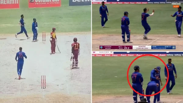 Sanju Samson fired the throw to wicketkeeper Rishabh Pant, and the latter visibly took his own sweet time, after being urged by skipper Rohit Sharma to remove the bails. Rohit clearly appeared furious at Pant’s playful act. Axar removed Mayers in his next over as West Indies stumbled to 64/4 by the end of the seventh over.