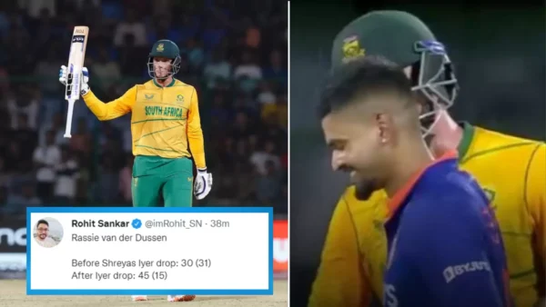 Shreyas Iyer dropped an easy catch of Rassie van der Dussen when he was on 29(30). RvD ended with 75 (46). Scored 45 in 15 after the drop.