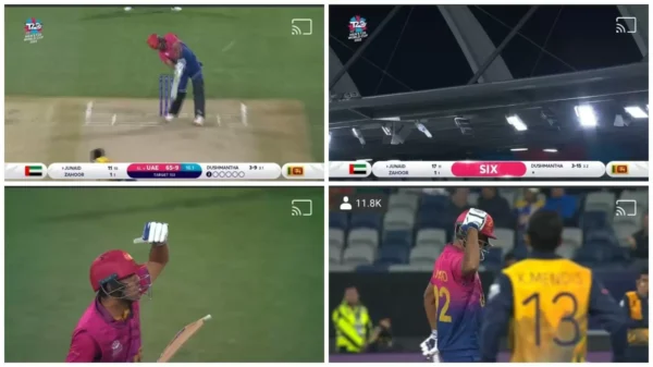 The ball was changed after the first ball of the 17th over in UAE’s chase of 153, with the team staring at a certain defeat, being positioned at 65/9. The ball, however, could be in play for no more than a minute, with Siddique clearing his front leg and swinging a length ball high over deep mid-wicket. The ball cleared the stadium, and the batter flexed his muscles while enjoying the result.