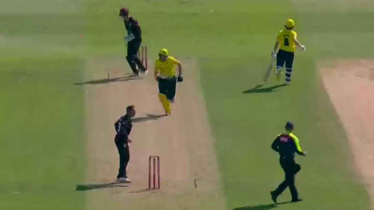 The incident came on the penultimate ball of Hampshire’s innings, with James Fuller facing Roelof van der Merwe. The left-arm spinner fired one outside off, and Fuller missed an attempted hoick. As the ball slipped out of wicket-keeper Tom Banton’s gloves, Dawson, from the non-striker’s’ end, set off for a non-existent single.