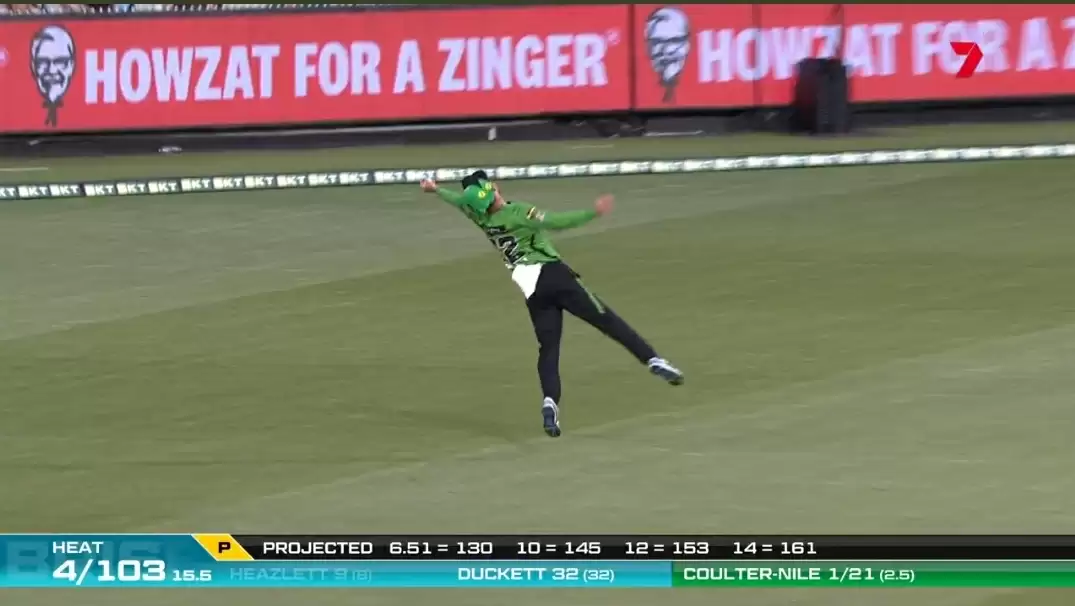 Maxwell took an absolute blinder running back from mid-on and taking a one-handed stunner. It was the 16th over of the innings and Brisbane Heat had just taken the power surge. Nathan Coulter-Nile was the bowler and he had conceded just four runs in as many balls in that over.