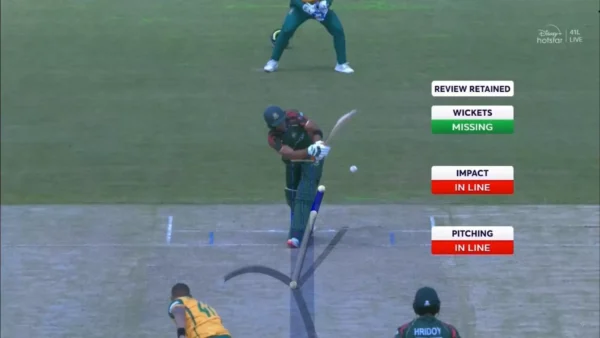 The ball hit the batter’s pads, and the umpire raised his finger soon after the South African players appealed, adjudging the batter out. However, Mahmudullah reviewed it immediately, and the replays confirmed the ball was sliding down leg, and the batter survived.