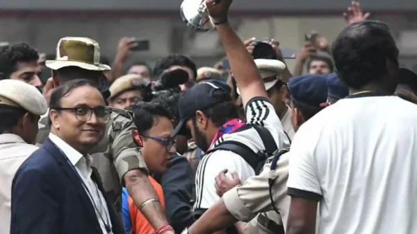 The team arrived at the IGI Airport in Delhi early, where a huge crowd of fans gathered to welcome them. After a 17-year wait, India secured their second T20 World Cup trophy. Rohit Sharma proudly showed off the trophy as fans cheered loudly.