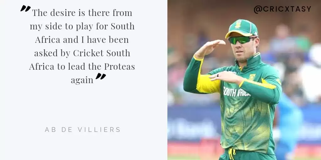 De Villiers, an explosive batsman, announced his retirement from all forms of international cricket in May, 2018 but of late there has been talks of an imminent return in the national team.”The desire is there from my side to play for South Africa and have been asked by Cricket South Africa to lead the Proteas again,” the 36-year-old De Villiers, who played 114 Tests, 228 ODIs and 78 T20s, said during Star Sports show ‘Cricket Connected’.